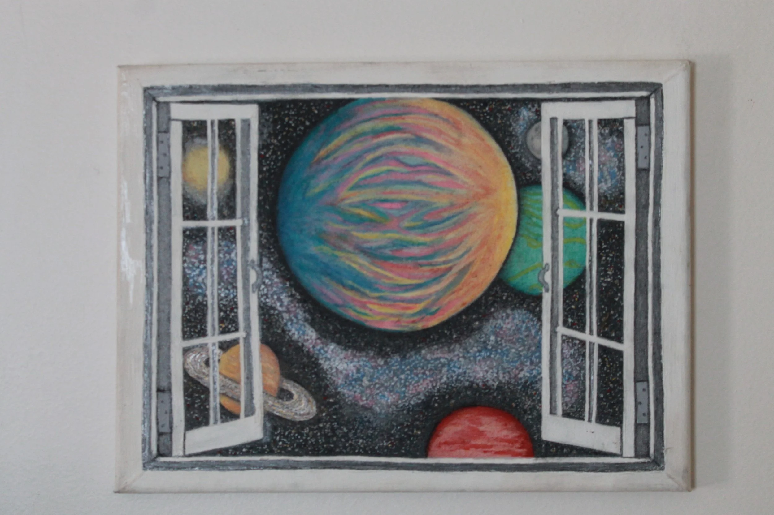 Created during a transitional period. A Window To Space holds the energy of safe observation and expanded awareness. The window serves as a grounded boundary – an intentional frame through which the vastness beyond can be witnessed without being crossed. The cosmic elements are layered with care, offering a sense of scale, calm, and perspective. Rather than pulling the viewer outward, the piece invites a gentle widening of awareness while remaining anchored in the present moment. Made entire with pastel chalk,, the work carries the imprint of touch and intuition, allowing softness and depth to coexist. This piece embodies the Aura Infused philosophy of chosen access–where we decide what we open to, how we engage, and where we remain rooted. A Window To Space is an offering of reassurance: even in times of uncertainty, we can safely look toward something larger and feel held where we stand.